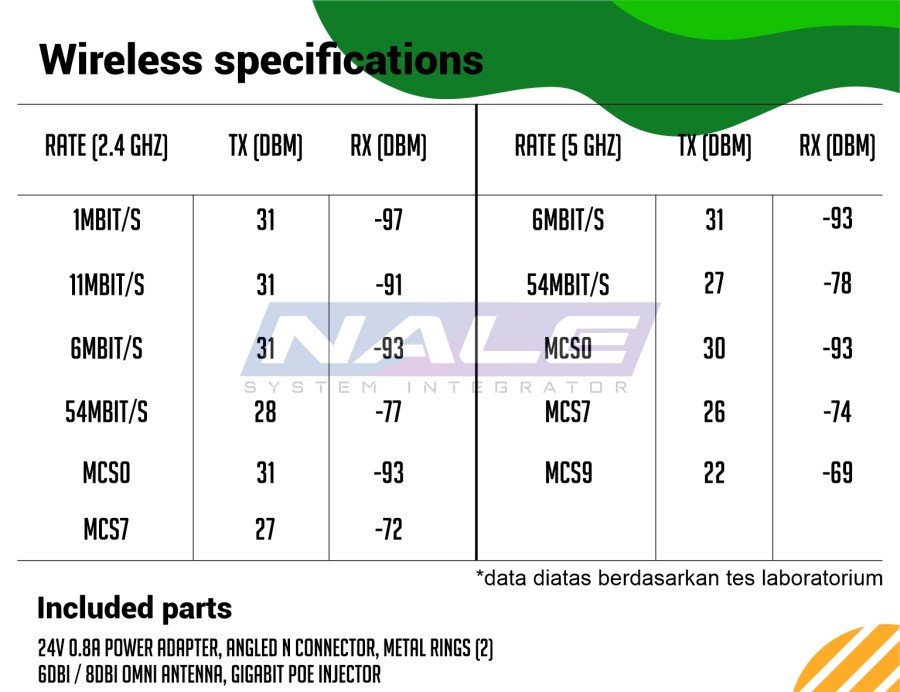 *sudah termasuk 24V 0.8A power adapter, Angled N connector, Metal rings (2), 6dBi / 8dBi omni antenna, Gigabit PoE injector
