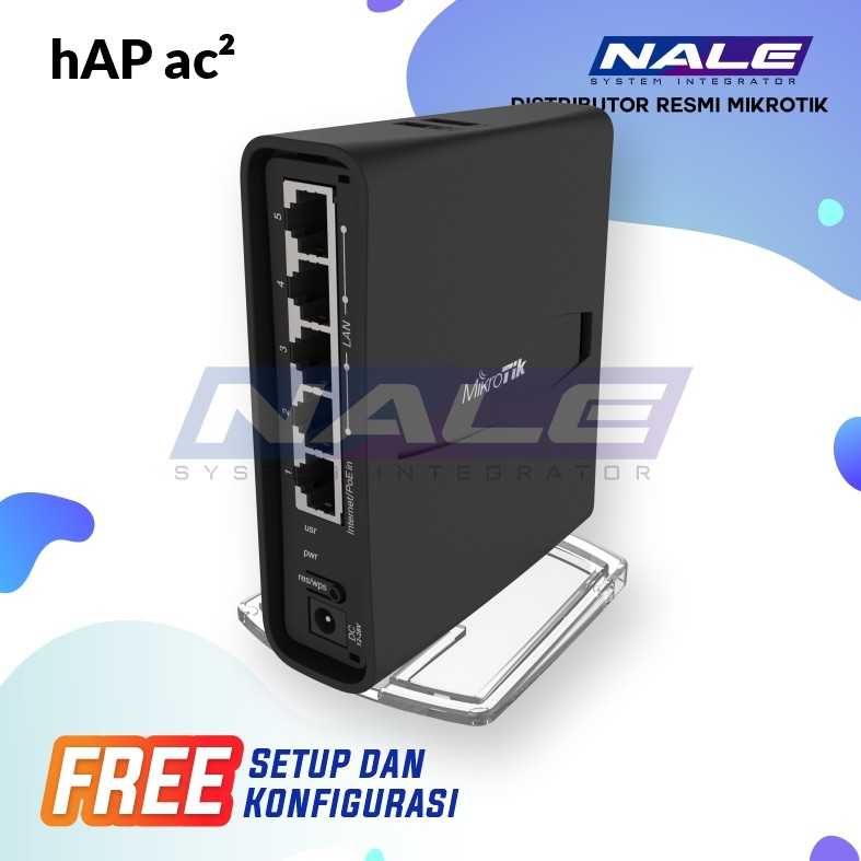[vc_row][vc_column][woodmart_title align=”left” tag=”h2″ woodmart_css_id=”602de667769e0″ title=”Deskripsi Mikrotik hAP ac²” woodmart_empty_space=”” title_width=”100″][vc_column_text text_larger=”no”]HAP ac² adalah Titik Akses bersamaan, yang menyediakan jangkauan Wifi untuk frekuensi 2,4 GHz dan 5 GHz pada waktu yang bersamaan. Lima port Ethernet 10/100/1000 menyediakan koneksi Gigabit untuk perangkat kabel Anda, USB dapat digunakan untuk penyimpanan eksternal atau modem 4G / LTE, dan perangkat mendukung akselerasi perangkat keras IPsec.[/vc_column_text][vc_column_text text_larger=”no”]Spesifikasi singkat: