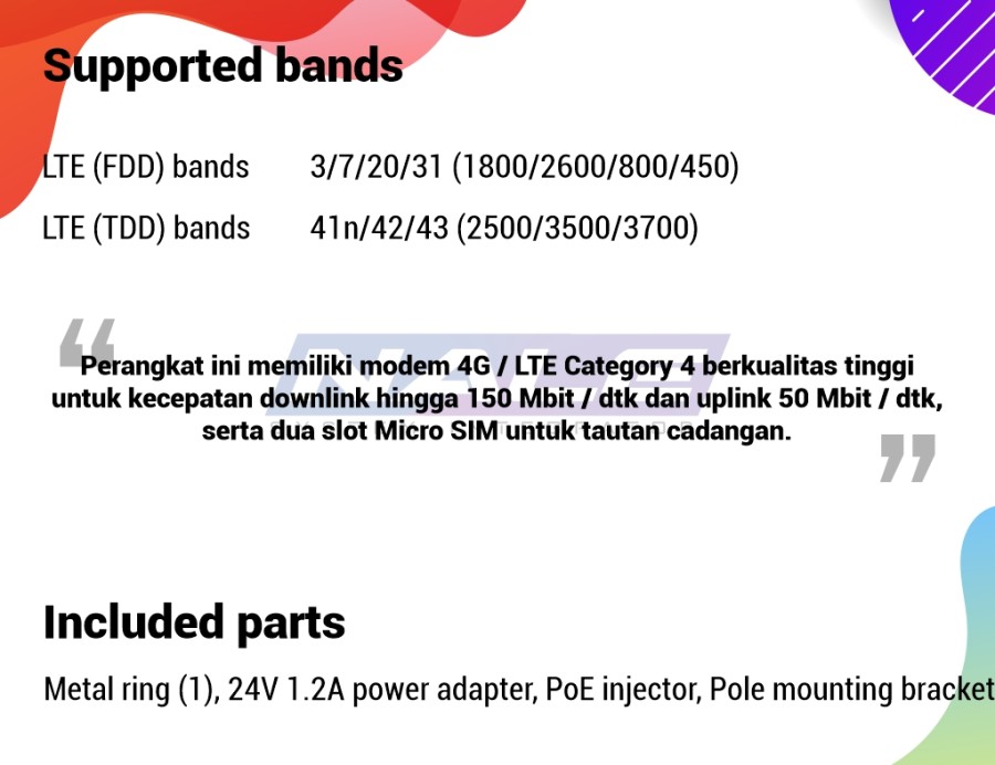 Unit ini dilengkapi dengan dua port Ethernet (port kedua memiliki fungsionalitas PoE-out), sehingga Anda dapat menggunakannya untuk menyalakan perangkat lain. Unit ini mencakup catu daya 24 V, tetapi dapat mendukung jangkauan penuh 12-57 V dan 18-57 V dengan PoE-Out dan sesuai dengan 802.3af / at.[/vc_column_text][vc_column_text text_larger=”no”]Spesifikasi singkat :